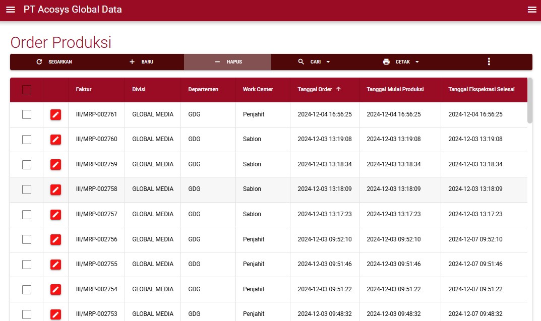 Mencatat order produksi dengan software (perangkat lunak) merupakan langkah penting dalam manajemen manufaktur modern. Proses ini melibatkan perekaman detail pesanan produksi ke dalam sistem, yang kemudian digunakan untuk perencanaan, penjadwalan, pengendalian, dan pelaporan produksi. Mencatat order produksi dengan software merupakan investasi yang penting bagi usaha manufaktur. Dengan memilih dan menerapkan software yang tepat, perusahaan dapat meningkatkan efisiensi, akurasi, dan pengendalian produksi, yang pada akhirnya akan berdampak positif pada profitabilitas dan daya saing.