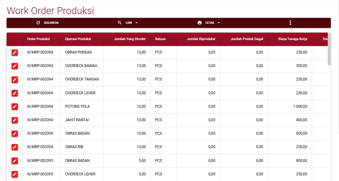 Mencatat work order (perintah kerja) produksi dengan software adalah praktik penting dalam manajemen manufaktur modern. Work order adalah dokumen yang memberikan otorisasi dan instruksi untuk memulai proses produksi. Dengan menggunakan software, proses pembuatan, pelacakan, dan penyelesaian work order menjadi lebih efisien dan terorganisir. Proses ini akan mempercepat pembuatan dan distribusi work order dibandingkan metode manual. Informasi yang dicatat dalam work order bervariasi seperti nomor WO, jenis pekerjaan, jenis bahan baku, dan siapa yang melaksanakan tugas tersebut.