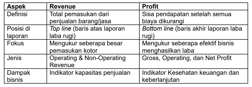 Revenue tidak memperhitungkan biaya apa pun. Angka ini murni mencerminkan seberapa besar pemasukan kotor yang diterima perusahaan dari aktivitas penjualan.